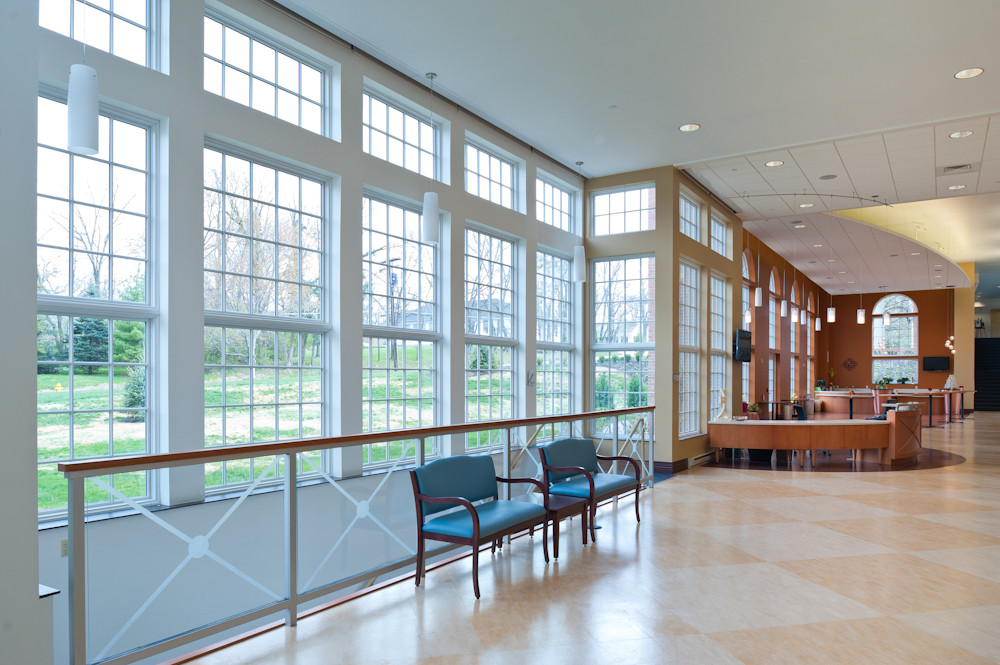 Faced with the potential emerging gulf between church members embracing traditional vs. contemporary worship, church leaders envisioned a new 250-seat Contemporary Worship Center that reinforces long-standing tradition by maintaining classic worship in the historic sanctuary, while specifically satisfying preferences for an “energizing service with modern style”. Complementing the church’s Federal Revival exterior, the 31,000 sf addition responds to the sophisticated acoustic, lighting, and video projection needs of contemporary worship — along with realizing another goal: a large fellowship gathering center. Therefore, each style of worship is accommodated in an appropriate setting, and opens off a common location where all can come together between worship services as a single congregation.