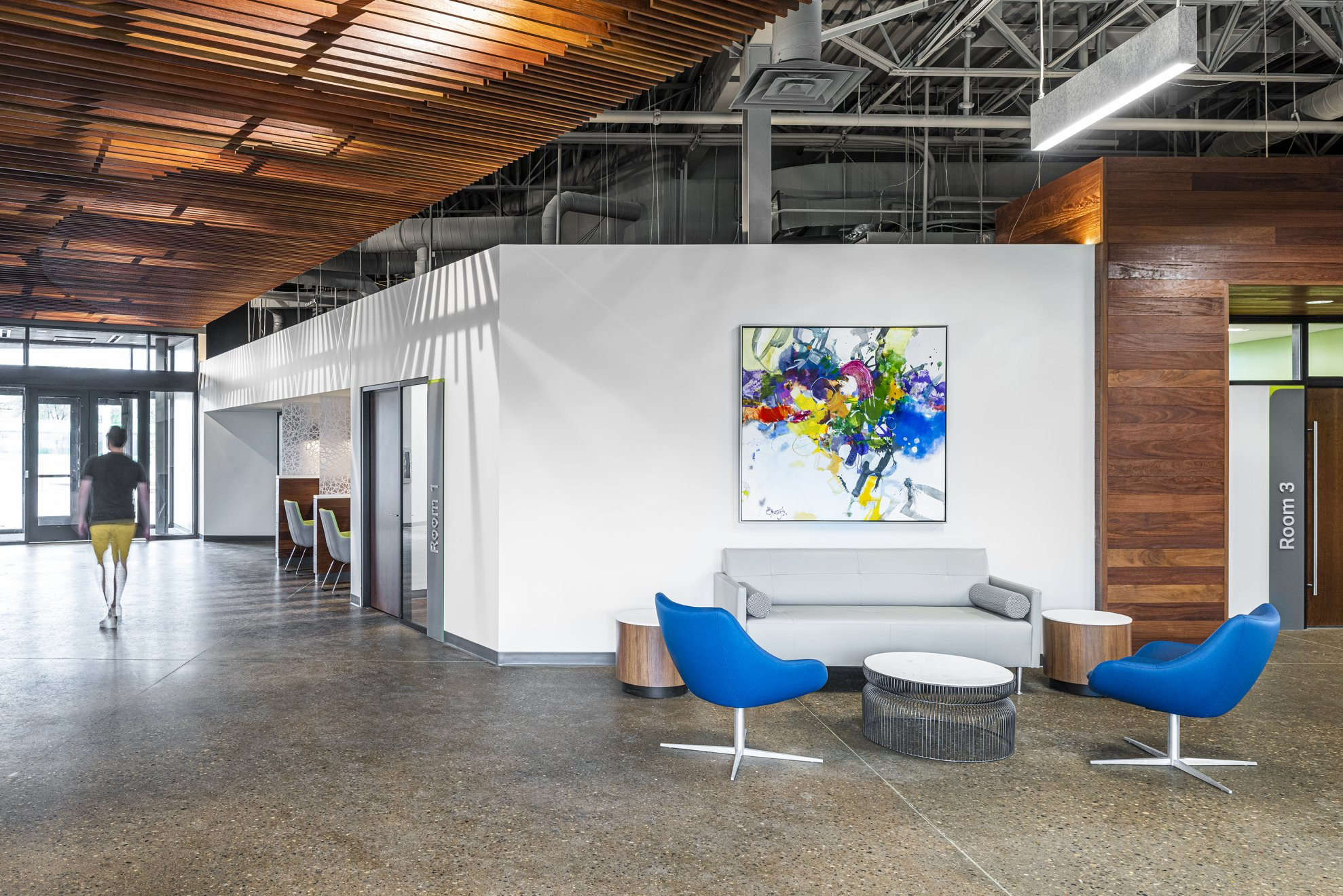 The Outpatient Clinic, known as “The Nest” provides an environment where residents develop the strength to leave on their own but can return without judgement if they need future healing. The design is organized into four parts known as the “intersection of hope”. An open flow with transparency at all ends symbolizes there are no barriers on the path of recovery. Cumaru hardwood is prominently used on the exterior and interior for its warmth and natural resistance to harsh environments, reflecting the resilience of the patients. A floating ceiling along the linear corridors tie spaces together with curved and flowing elements, reflecting the idea that the path of recovery is a direction but not a straight line.