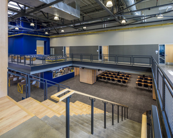 The Maker Space serves as a highly visible feature that connects the high-bay to Nitchke Hall and creates significant possibilities for collaboration with external industry. A portion of the high-bay, the Turbine Lab, is currently being leased by the Department of Defense.