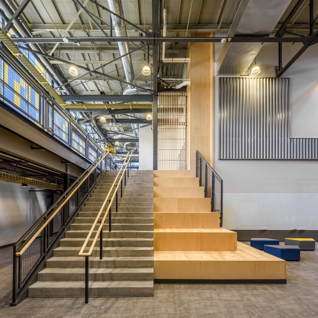 This first phase of this design included the complete reclad of the existing 25,000 SF high-bay with a combination of architectural metal panels, curtainwall and storefront, providing a vibrant, high quality envelope to anchor the north end of the College of Engineering. Phase 1 also included preliminary demolition of remaining components within the high-bay, including the observation mezzanine which originally supported manufacturing functions. At the end of demolition, 3D scanning of the complex interior was performed to provide crucial information on structural and infrastructural components that will be altered/impacted in future phases of construction.